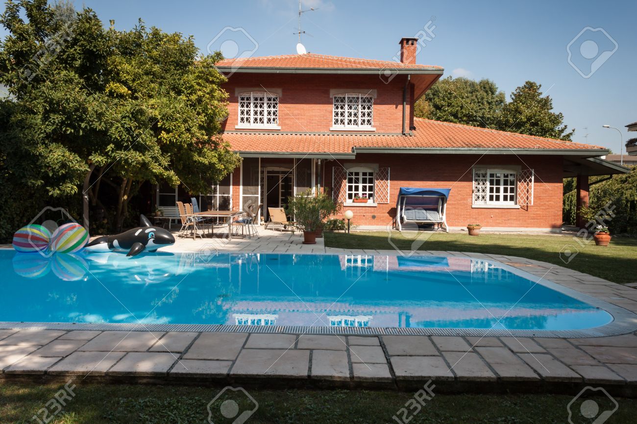 庭とスイミング プール付きの素敵な別荘の外観 の写真素材 画像素材 Image
